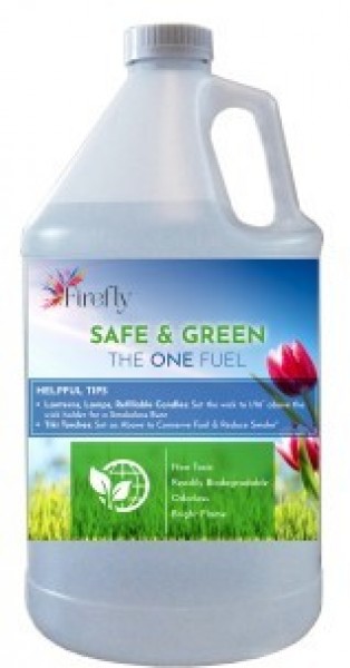 Firefly Safe & Green (No longer available due to exorbitant price and availability) Firefly The One Eco-Friendly Tiki Torch Fuel and Lamp Oil is our newest fuel and by far provides the cleanest and virtually smoke-free flame of any fuel on the market. Our testing demonstrates cleaner wicks, no soot, and can be used in any wicked-powered Tiki Torch, covered or open oil lantern or oil lamp, fire pot, and ventless fireplace with a mat wick. This fuel burns extraordinarily clean with vitally no pollutants. I have saved the best for last. Firefly Safe & Green Fuel is a 100% organic fuel that is fully sustainable. There is NO Ethanol or Petroleum used in Safe and Green fuel!